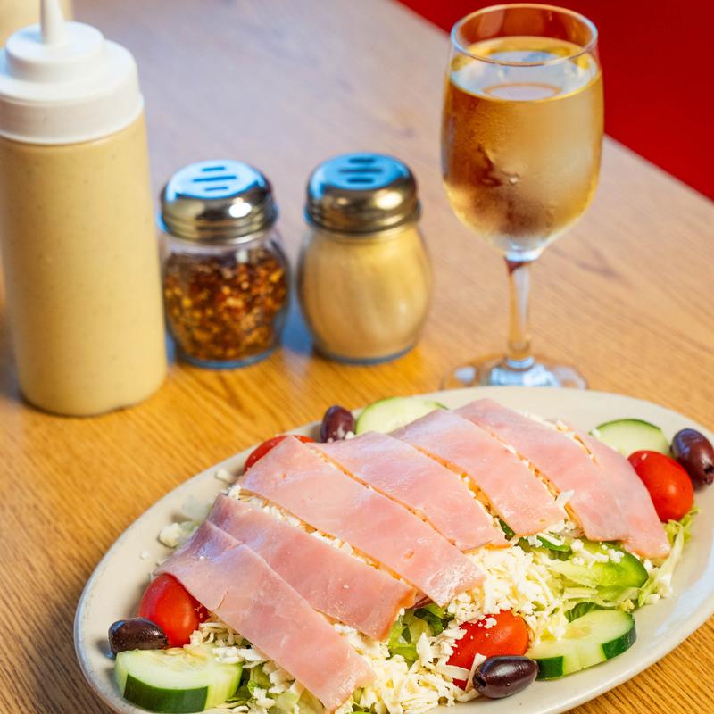 Lettuce, tomatoes, onions, cucumbers, green peppers, Greek black olives, mild banana peppers, anchovies or ham, cotto salami, genoa salami, mozzarella cheese with house dressing