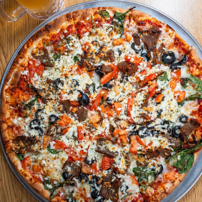 Small $12.65 | Large $19.80 • Feta and mozzarella cheese, sliced black olives, tomatoes, olive oil, oregano and a touch of garlic, spinach and pizza sauce • Add Gyro Meat Small $15.20 | Large $24.30