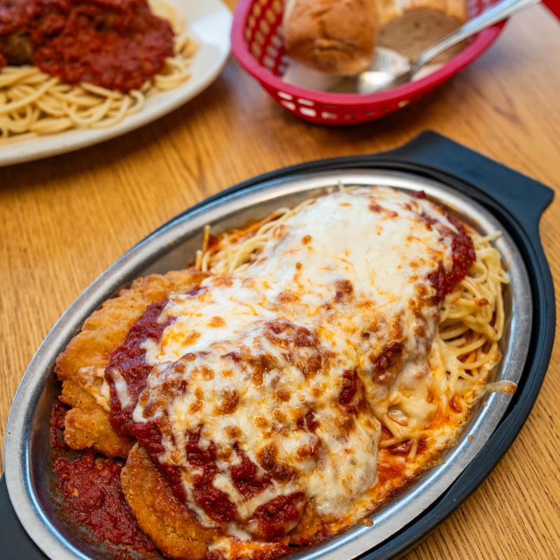 Fried topped round veal, mozzarella, parmesan style with spaghetti and meat sauce
